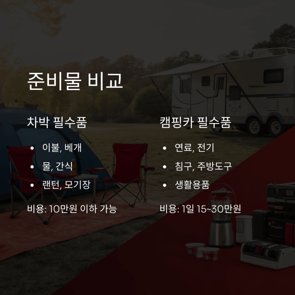 – 캠핑카는 대부분 해결되며, 차박은 캠핑장 이용이나 포터블 장비가 필요합니다.